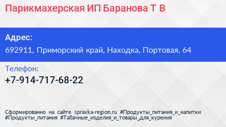 Парикмахерская, ИП Баранова Т.В. по адресу 692911, Приморский край, Находка, Портовая, 64 в дальнейшем Организация, размещена в следующих категориях: