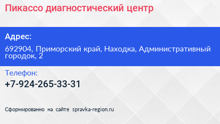 Пикассо, диагностический центр по адресу 692904, Приморский край, Находка, Административный городок, 2 в дальнейшем Организация, размещена в следующих категориях: