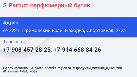 S Parfum, парфюмерный бутик по адресу 692924, Приморский край, Находка, Спортивная, 2-2а в дальнейшем Организация, размещена в следующих категориях: