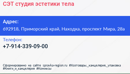 СЭТ, студия эстетики тела по адресу 692918, Приморский край, Находка, проспект Мира, 28а в дальнейшем Организация, размещена в следующих категориях: