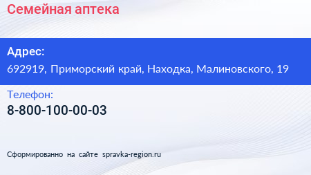 Семейная аптека по адресу 692919, Приморский край, Находка, Малиновского, 19 в дальнейшем Организация, размещена в следующих категориях: