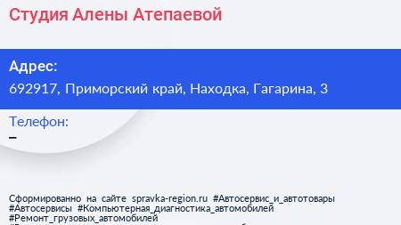 Студия Алены Атепаевой по адресу 692917, Приморский край, Находка, Гагарина, 3 в дальнейшем Организация, размещена в следующих категориях: