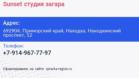 Sunset, студия загара по адресу 692904, Приморский край, Находка, Находкинский проспект, 12 в дальнейшем Организация, размещена в следующих категориях: