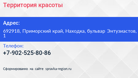 Территория красоты по адресу 692918, Приморский край, Находка, бульвар Энтузиастов, 1 в дальнейшем Организация, размещена в следующих категориях: