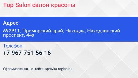 Top Salon, салон красоты по адресу 692911, Приморский край, Находка, Находкинский проспект, 44а в дальнейшем Организация, размещена в следующих категориях: