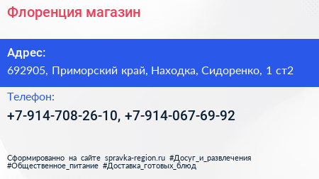 Флоренция, магазин по адресу 692905, Приморский край, Находка, Сидоренко, 1 ст2 в дальнейшем Организация, размещена в следующих категориях: