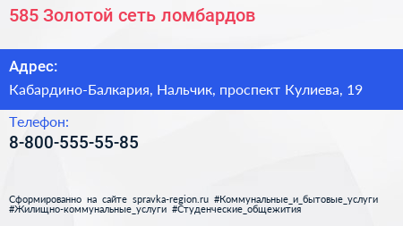 585*Золотой, сеть ломбардов по адресу Кабардино-Балкария, Нальчик, проспект Кулиева, 19 в дальнейшем Организация, размещена в следующих категориях: