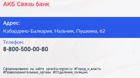 АКБ Связь-банк по адресу Кабардино-Балкария, Нальчик, Пушкина, 62 в дальнейшем Организация, размещена в следующих категориях:
