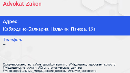 Advokat-Zakon по адресу Кабардино-Балкария, Нальчик, Пачева, 19а в дальнейшем Организация, размещена в следующих категориях: