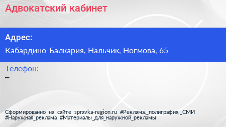 Адвокатский кабинет по адресу Кабардино-Балкария, Нальчик, Ногмова, 65 в дальнейшем Организация, размещена в следующих категориях: