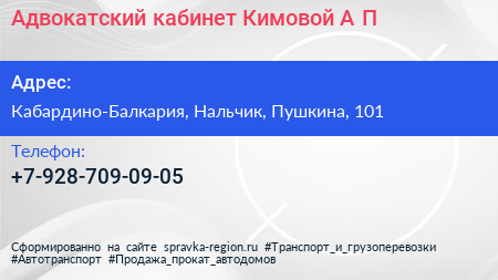 Адвокатский кабинет Кимовой А.П. по адресу Кабардино-Балкария, Нальчик, Пушкина, 101 в дальнейшем Организация, размещена в следующих категориях: