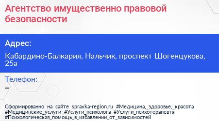 Агентство имущественно-правовой безопасности по адресу Кабардино-Балкария, Нальчик, проспект Шогенцукова, 25а в дальнейшем Организация, размещена в следующих категориях: