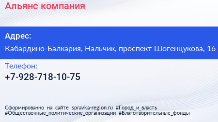 Альянс, компания по адресу Кабардино-Балкария, Нальчик, проспект Шогенцукова, 16 в дальнейшем Организация, размещена в следующих категориях: