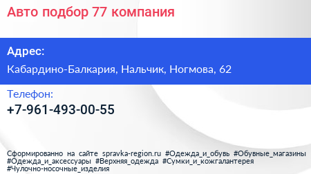 Авто-подбор 77, компания по адресу Кабардино-Балкария, Нальчик, Ногмова, 62 в дальнейшем Организация, размещена в следующих категориях: