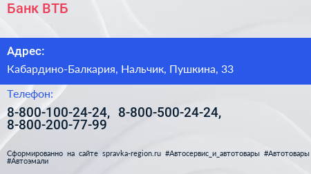 Банк ВТБ по адресу Кабардино-Балкария, Нальчик, Пушкина, 33 в дальнейшем Организация, размещена в следующих категориях: