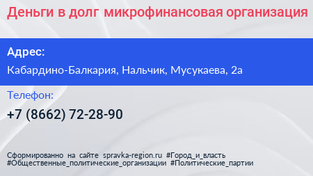 Деньги в долг, микрофинансовая организация по адресу Кабардино-Балкария, Нальчик, Мусукаева, 2а в дальнейшем Организация, размещена в следующих категориях: