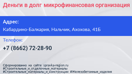 Деньги в долг, микрофинансовая организация по адресу Кабардино-Балкария, Нальчик, Ахохова, 41Б в дальнейшем Организация, размещена в следующих категориях: