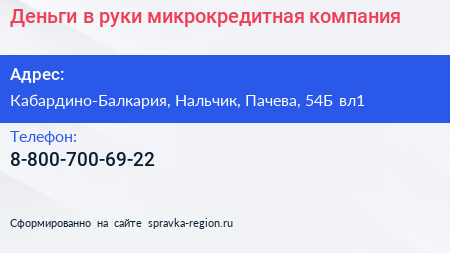 Деньги в руки, микрокредитная компания по адресу Кабардино-Балкария, Нальчик, Пачева, 54Б вл1 в дальнейшем Организация, размещена в следующих категориях: