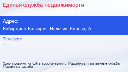 Единая служба недвижимости по адресу Кабардино-Балкария, Нальчик, Кирова, 2г в дальнейшем Организация, размещена в следующих категориях: