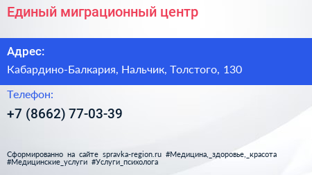 Единый миграционный центр по адресу Кабардино-Балкария, Нальчик, Толстого, 130 в дальнейшем Организация, размещена в следующих категориях: