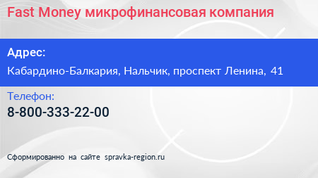Fast Money, микрофинансовая компания по адресу Кабардино-Балкария, Нальчик, проспект Ленина, 41 в дальнейшем Организация, размещена в следующих категориях: