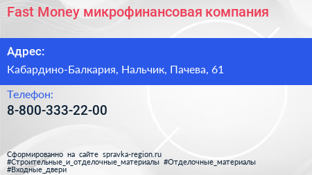 Fast Money, микрофинансовая компания по адресу Кабардино-Балкария, Нальчик, Пачева, 61 в дальнейшем Организация, размещена в следующих категориях: