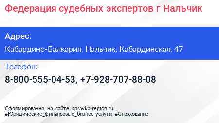 Федерация судебных экспертов, г. Нальчик по адресу Кабардино-Балкария, Нальчик, Кабардинская, 47 в дальнейшем Организация, размещена в следующих категориях:
