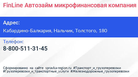 FinLine-Автозайм, микрофинансовая компания по адресу Кабардино-Балкария, Нальчик, Толстого, 180 в дальнейшем Организация, размещена в следующих категориях: