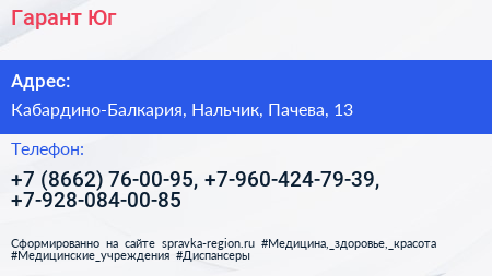 Гарант Юг по адресу Кабардино-Балкария, Нальчик, Пачева, 13 в дальнейшем Организация, размещена в следующих категориях: