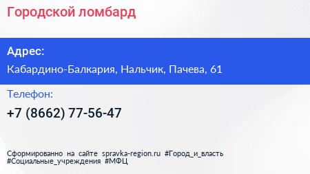 Городской, ломбард по адресу Кабардино-Балкария, Нальчик, Пачева, 61 в дальнейшем Организация, размещена в следующих категориях: