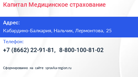 Капитал Медицинское страхование по адресу Кабардино-Балкария, Нальчик, Лермонтова, 25 в дальнейшем Организация, размещена в следующих категориях: