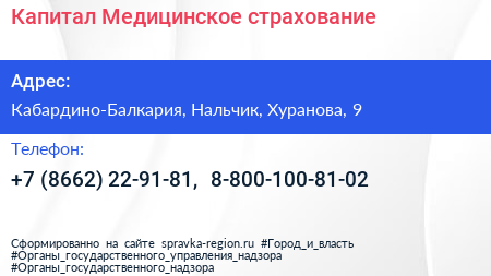 Капитал Медицинское страхование по адресу Кабардино-Балкария, Нальчик, Хуранова, 9 в дальнейшем Организация, размещена в следующих категориях: