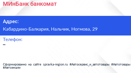 МИнБанк, банкомат по адресу Кабардино-Балкария, Нальчик, Ногмова, 29 в дальнейшем Организация, размещена в следующих категориях: