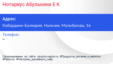 Нотариус Абулькина Е.К. по адресу Кабардино-Балкария, Нальчик, Мальбахова, 16 в дальнейшем Организация, размещена в следующих категориях: