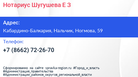 Нотариус Шугушева Е.З. по адресу Кабардино-Балкария, Нальчик, Ногмова, 59 в дальнейшем Организация, размещена в следующих категориях: