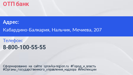 ОТП банк по адресу Кабардино-Балкария, Нальчик, Мечиева, 207 в дальнейшем Организация, размещена в следующих категориях: