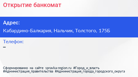 Открытие, банкомат по адресу Кабардино-Балкария, Нальчик, Толстого, 175Б в дальнейшем Организация, размещена в следующих категориях: