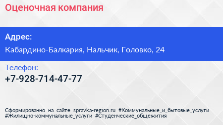 Оценочная компания по адресу Кабардино-Балкария, Нальчик, Головко, 24 в дальнейшем Организация, размещена в следующих категориях: