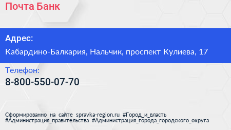Почта Банк по адресу Кабардино-Балкария, Нальчик, проспект Кулиева, 17 в дальнейшем Организация, размещена в следующих категориях: