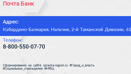 Почта Банк по адресу Кабардино-Балкария, Нальчик, 2-й Таманской Дивизии, 61 в дальнейшем Организация, размещена в следующих категориях: