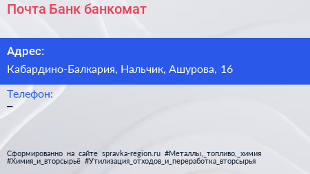 Почта Банк, банкомат по адресу Кабардино-Балкария, Нальчик, Ашурова, 16 в дальнейшем Организация, размещена в следующих категориях: