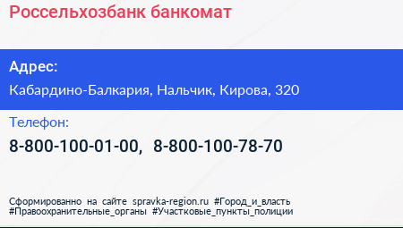 Россельхозбанк, банкомат по адресу Кабардино-Балкария, Нальчик, Кирова, 320 в дальнейшем Организация, размещена в следующих категориях: