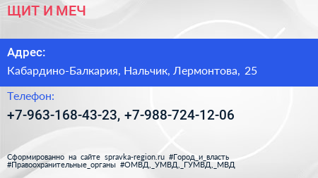 ЩИТ И МЕЧ по адресу Кабардино-Балкария, Нальчик, Лермонтова, 25 в дальнейшем Организация, размещена в следующих категориях:
