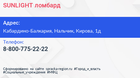SUNLIGHT, ломбард по адресу Кабардино-Балкария, Нальчик, Кирова, 1д в дальнейшем Организация, размещена в следующих категориях: