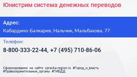 Юнистрим, система денежных переводов по адресу Кабардино-Балкария, Нальчик, Мальбахова, 77 в дальнейшем Организация, размещена в следующих категориях: