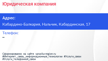 Юридическая компания по адресу Кабардино-Балкария, Нальчик, Кабардинская, 17 в дальнейшем Организация, размещена в следующих категориях: