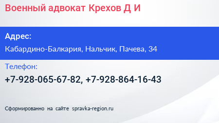 Военный адвокат Крехов Д.И. по адресу Кабардино-Балкария, Нальчик, Пачева, 34 в дальнейшем Организация, размещена в следующих категориях: