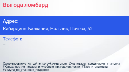Выгода, ломбард по адресу Кабардино-Балкария, Нальчик, Пачева, 52 в дальнейшем Организация, размещена в следующих категориях: