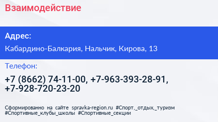 Взаимодействие по адресу Кабардино-Балкария, Нальчик, Кирова, 13 в дальнейшем Организация, размещена в следующих категориях: