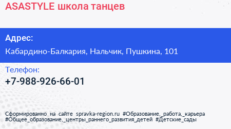ASASTYLE, школа танцев по адресу Кабардино-Балкария, Нальчик, Пушкина, 101 в дальнейшем Организация, размещена в следующих категориях: